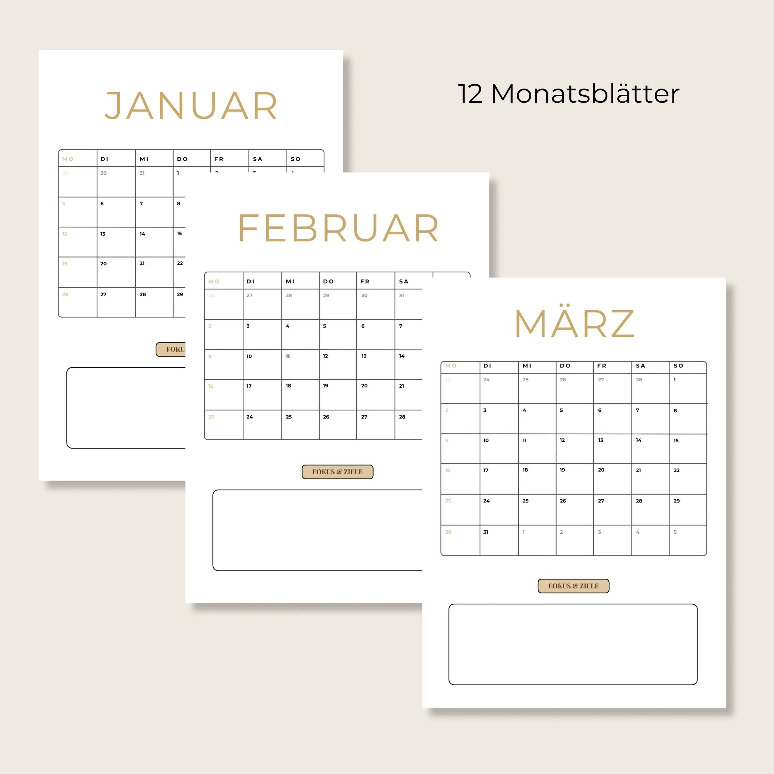 Der Kalender umfasst eine übersichtliche Jahresseite sowie 12 Monatsblätter, die dir ausreichend Platz für Prioritäten und Monatsziele bieten. Perfekt geeignet für alle, die stilvolle und funktionale Planungshelfer schätzen.