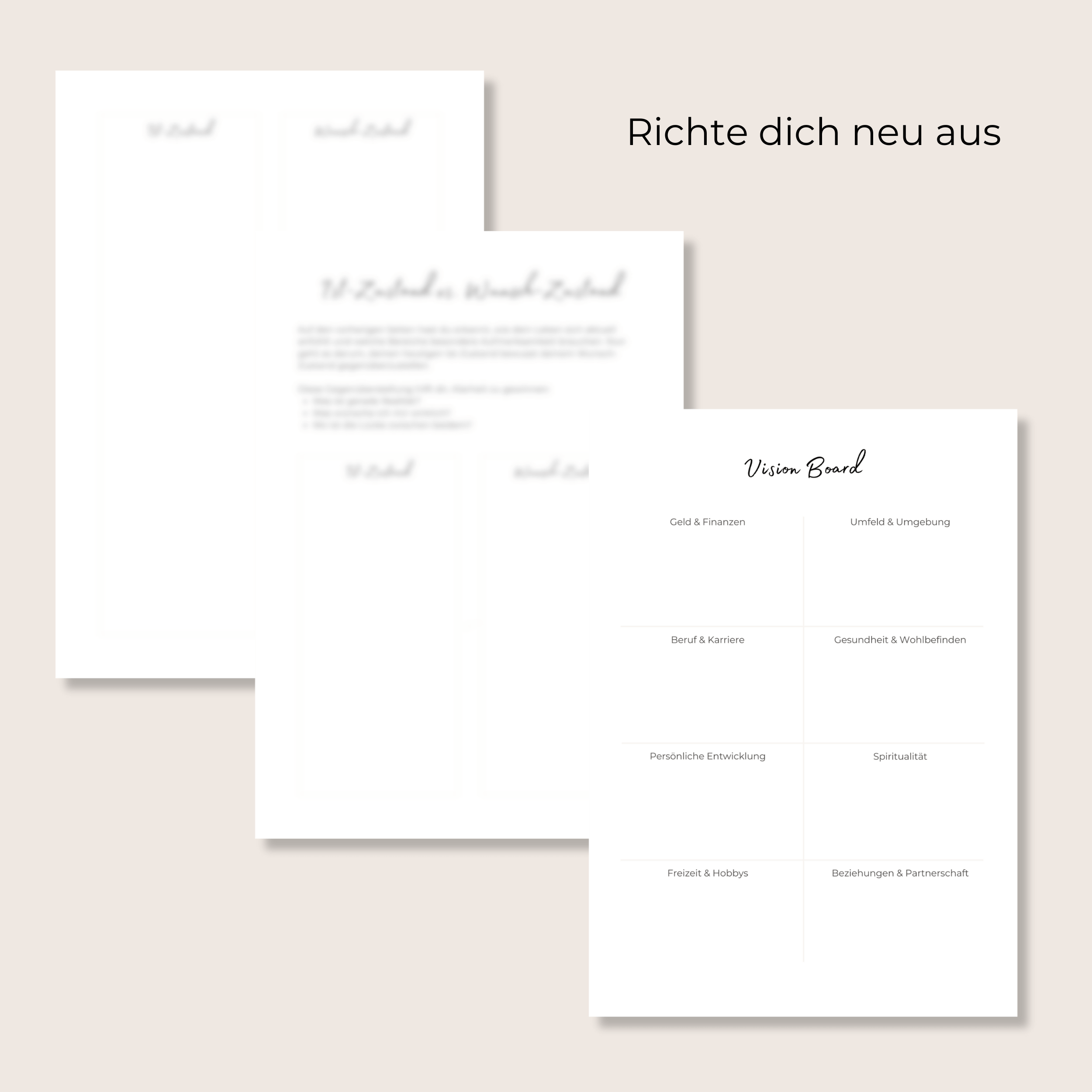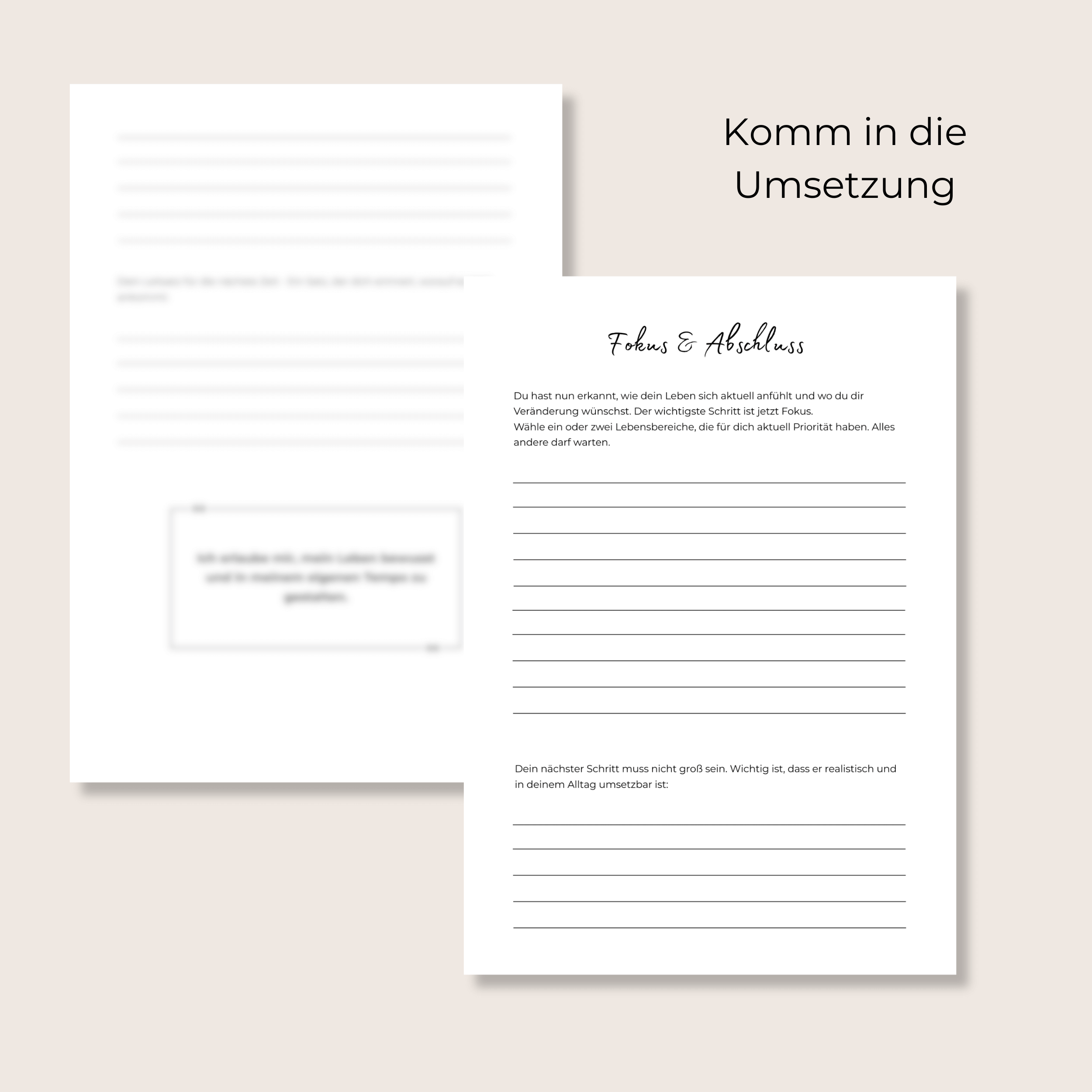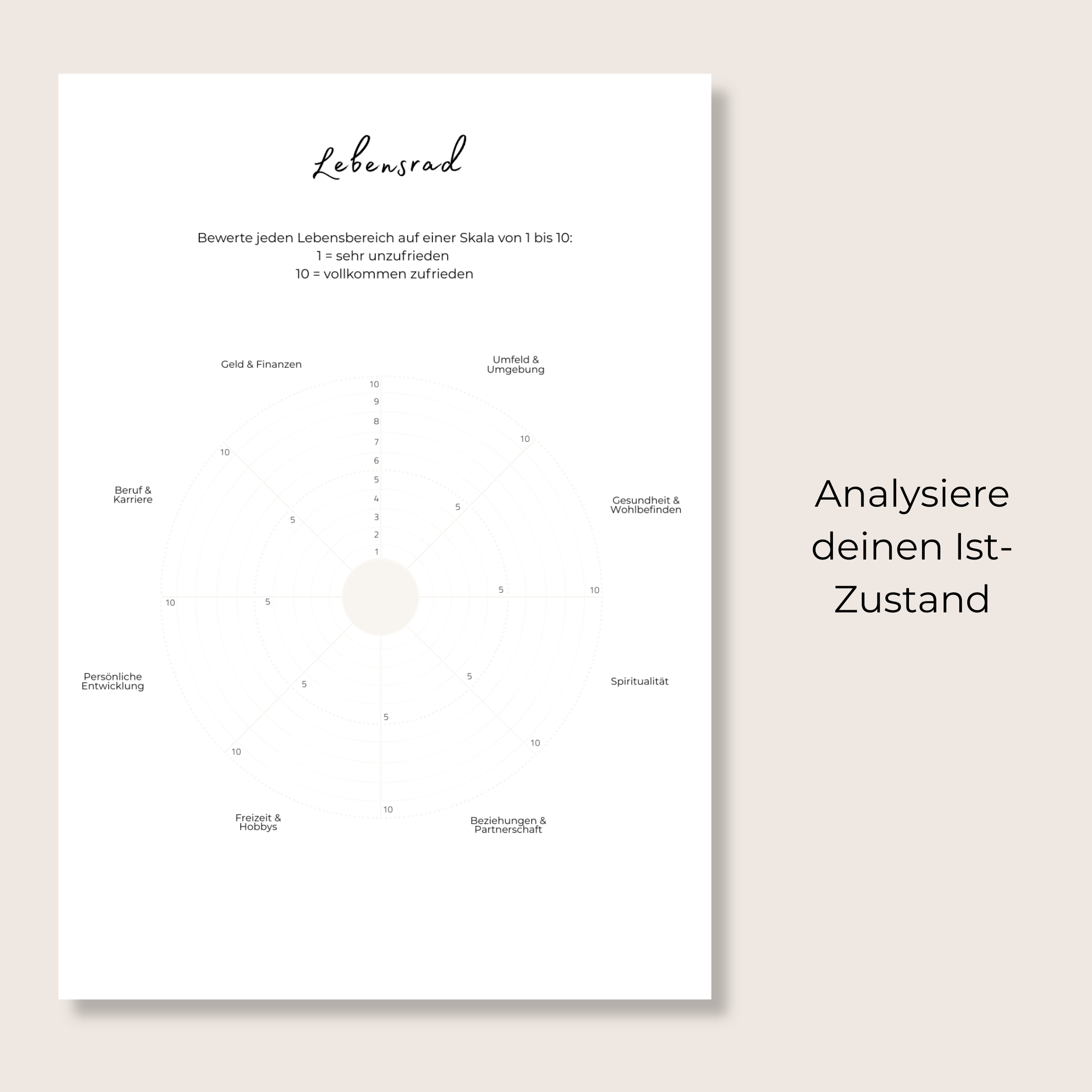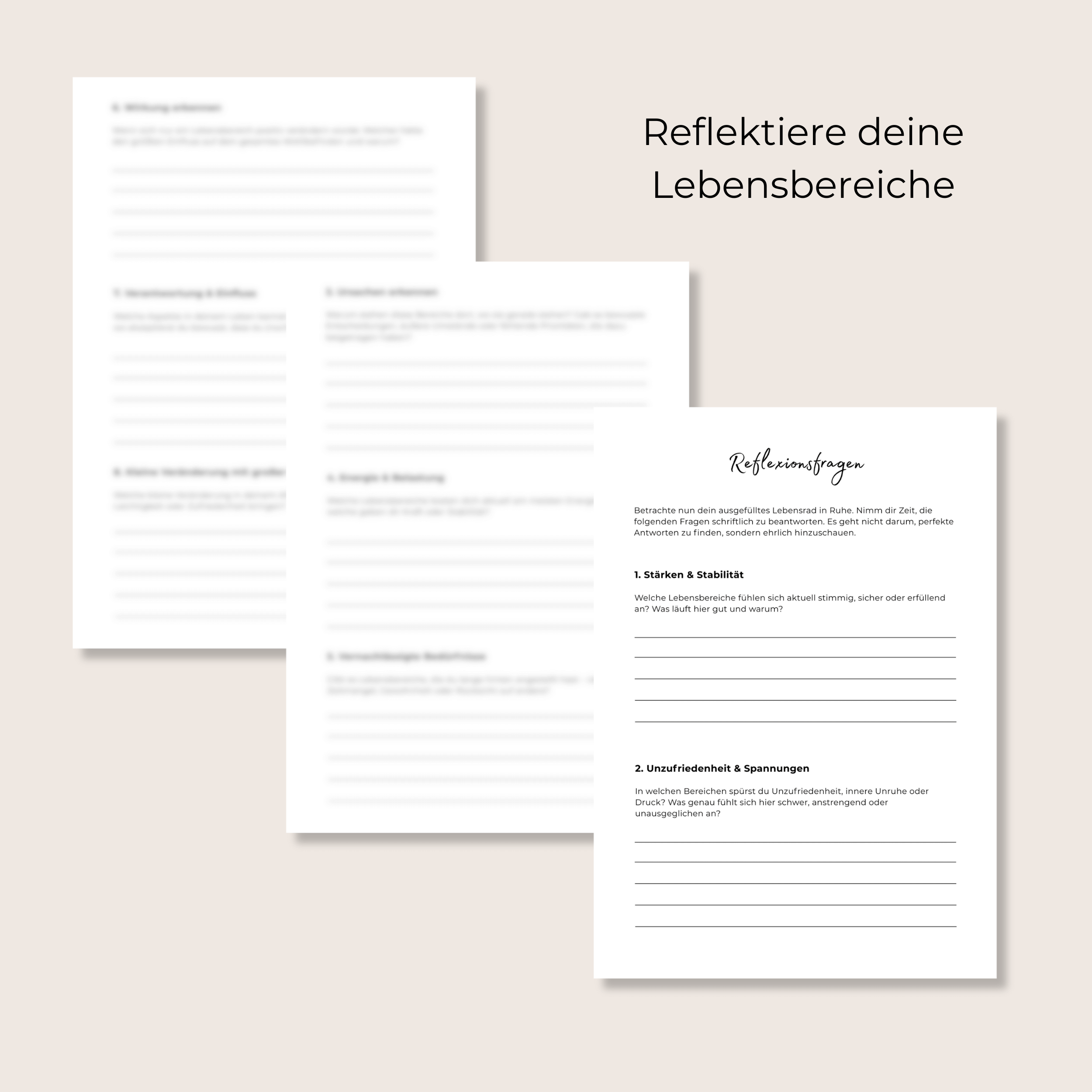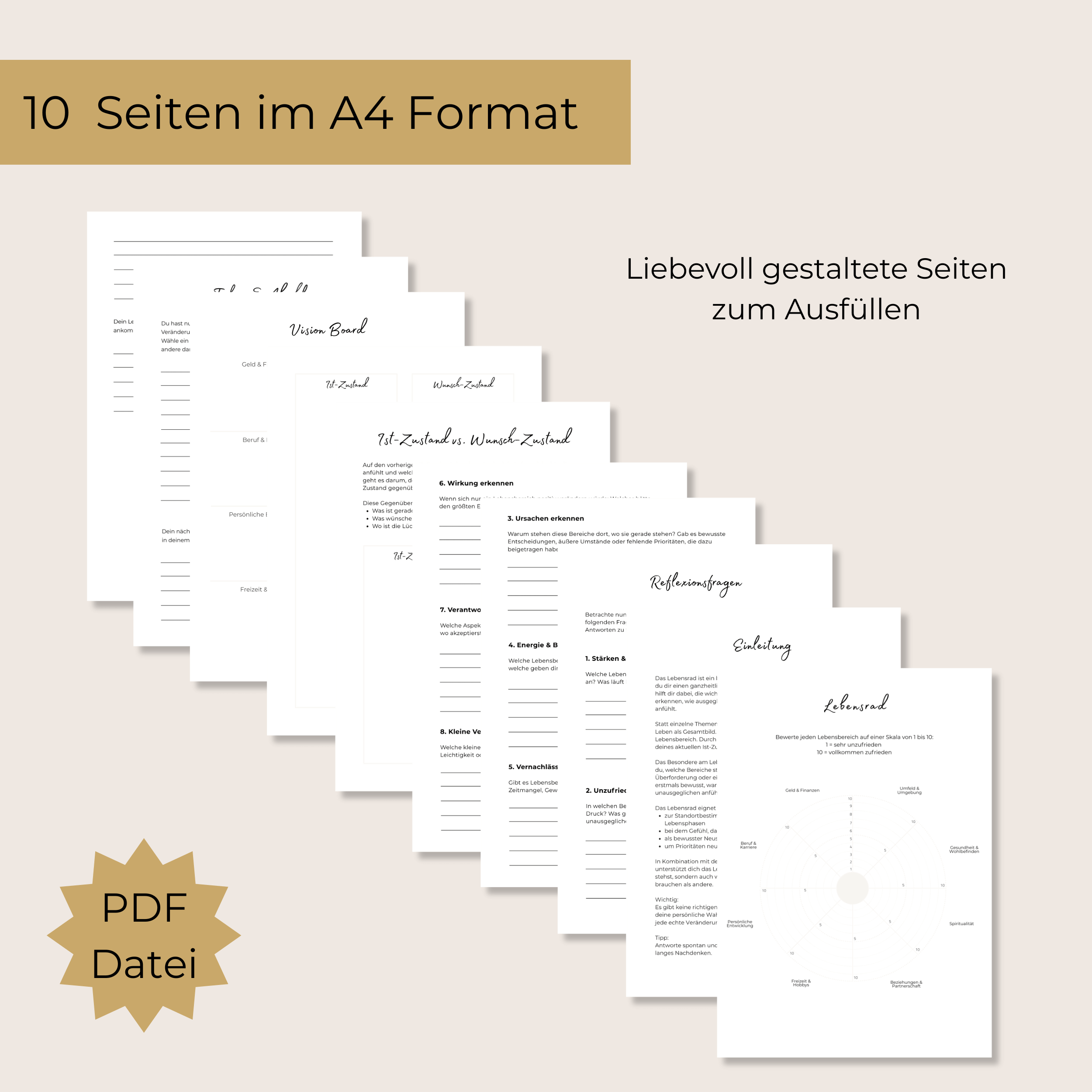Mit nur wenigen, gezielt aufgebauten Seiten bekommst du einen ganzheitlichen Überblick über deine wichtigsten Lebensbereiche und erkennst, wo Veränderung sinnvoll ist – ohne Druck, ohne Überforderung.