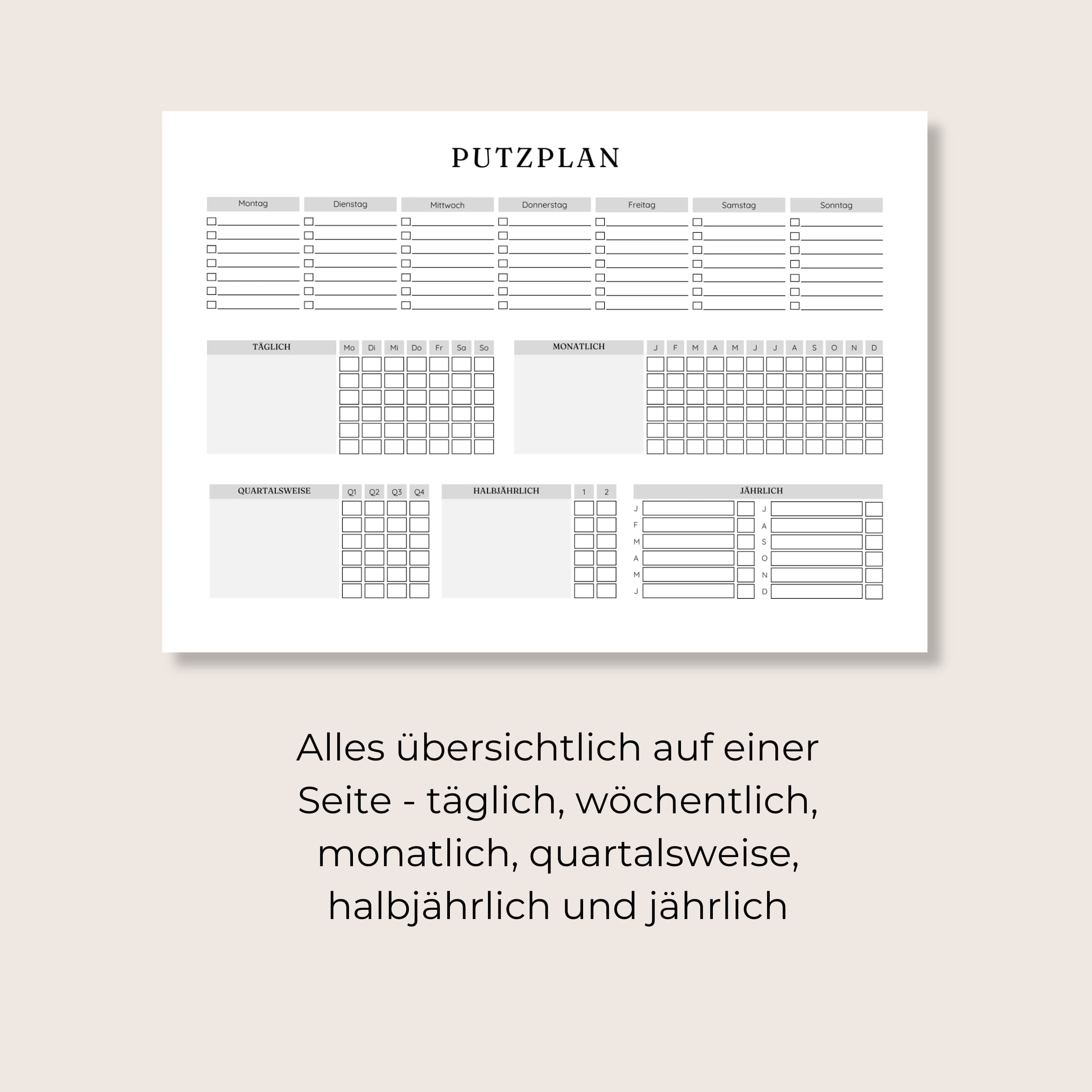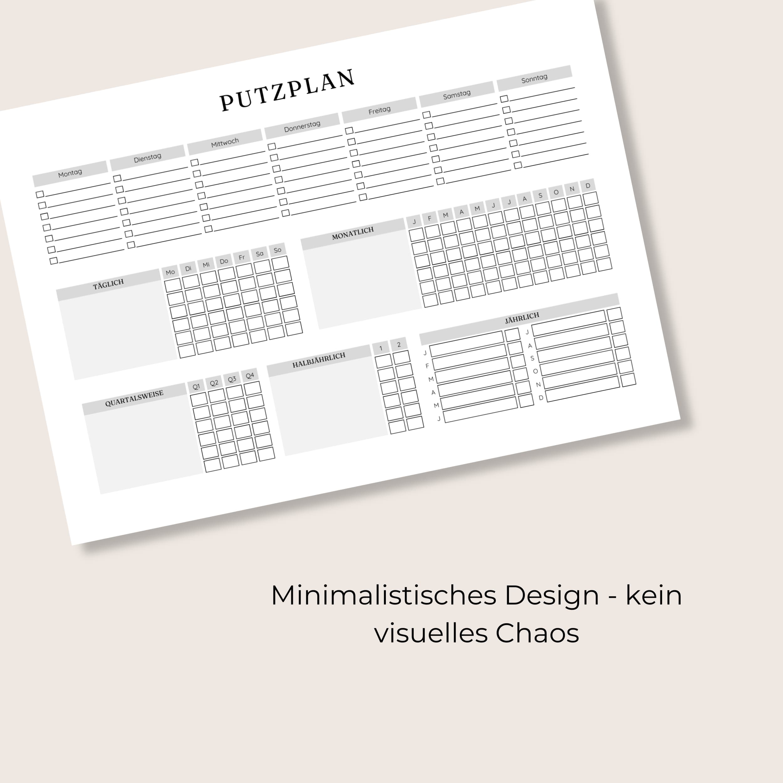 Dieser übersichtlich gestaltete Putzplan hilft dir dabei, alle Reinigungsaufgaben strukturiert und stressfrei zu organisieren – egal ob täglich, wöchentlich, monatlich oder jährlich.